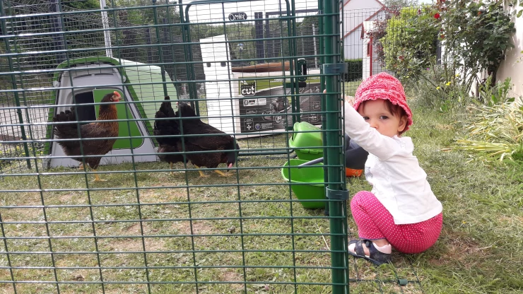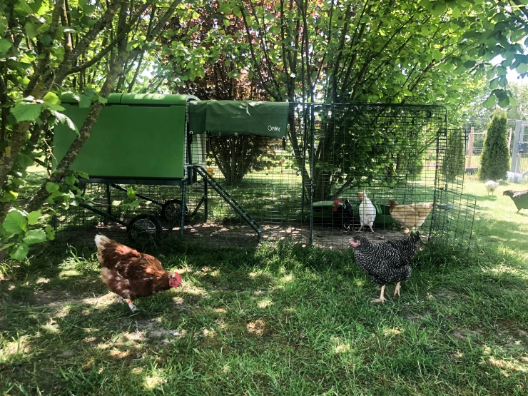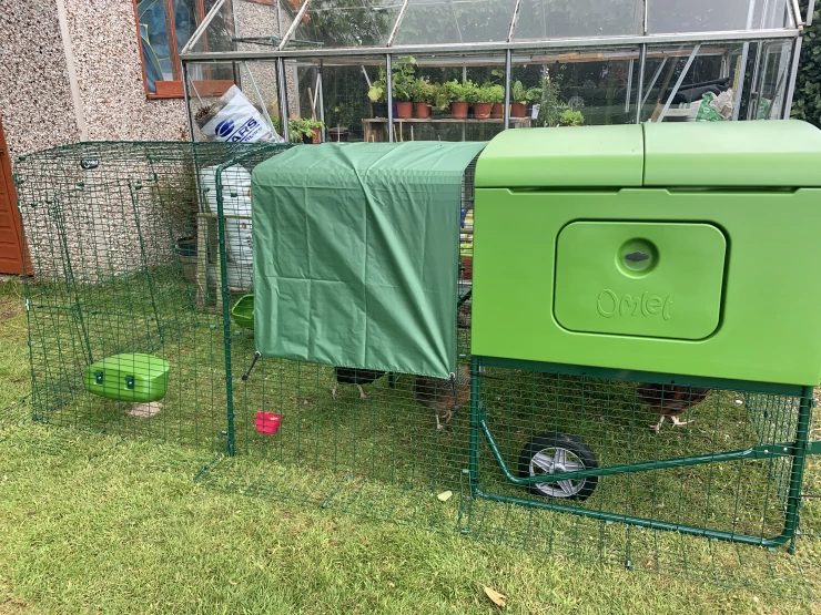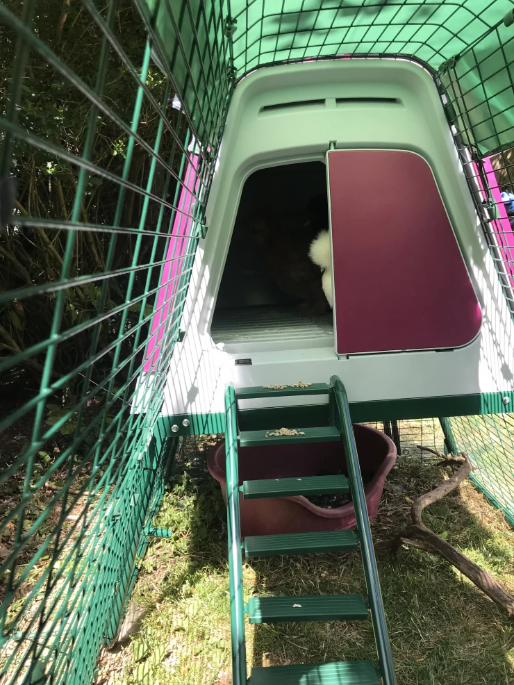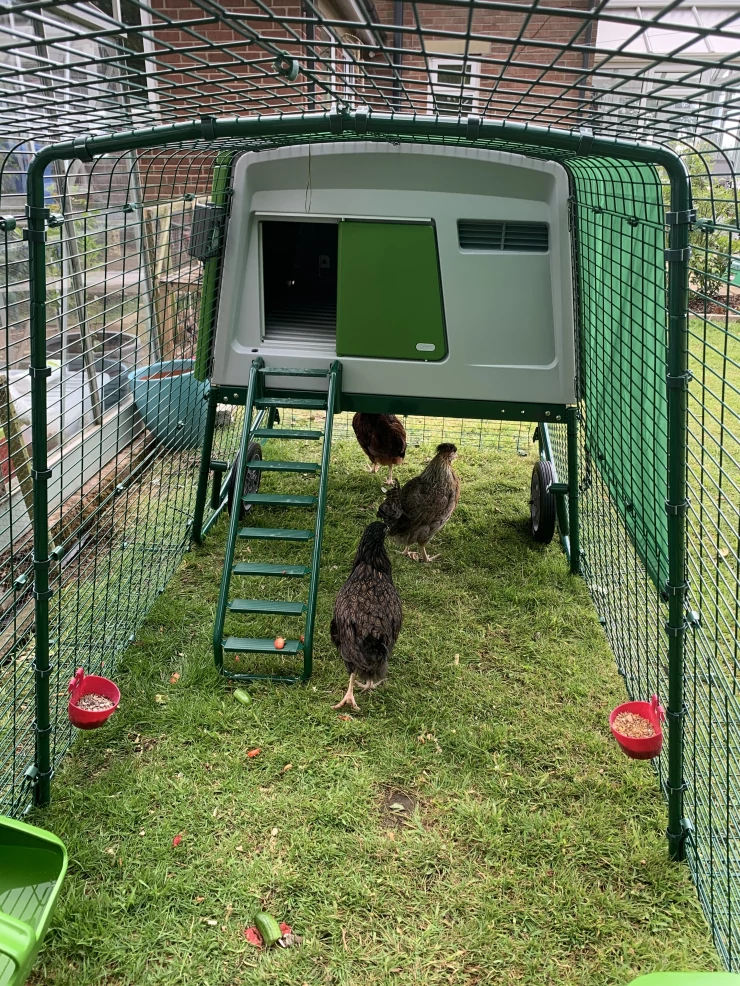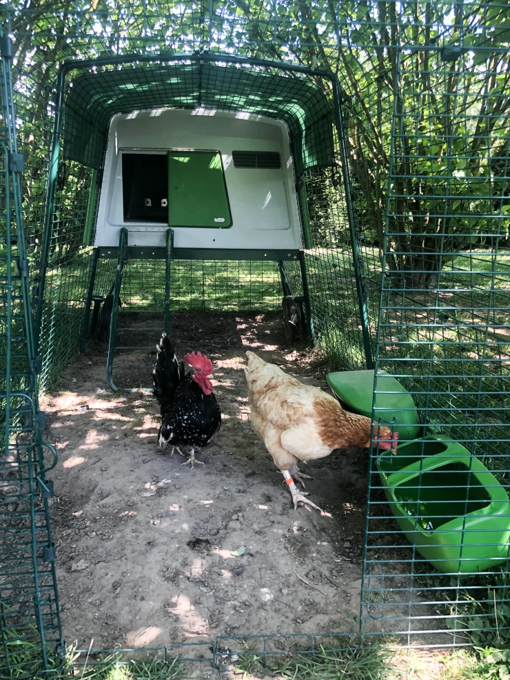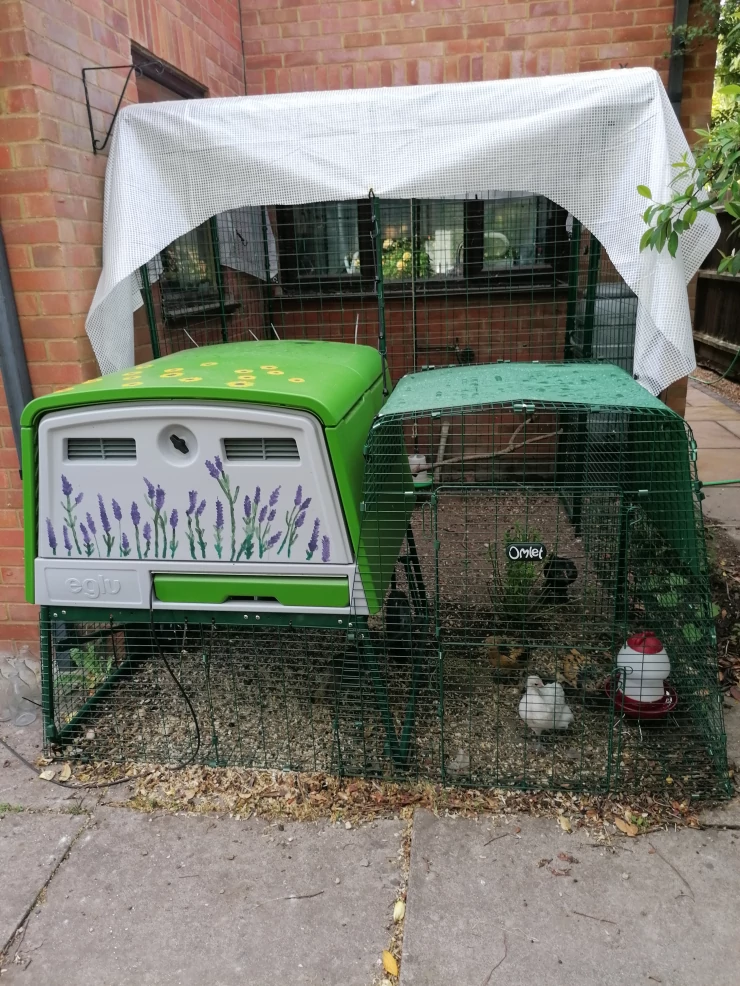 Beskrivelse: Vores Eglu Cube og løbegård, der er fastgjort til den 2 m x 2 m store løbegård. min søster har dekoreret den med malede blomster, og det ser virkelig smukt ud.