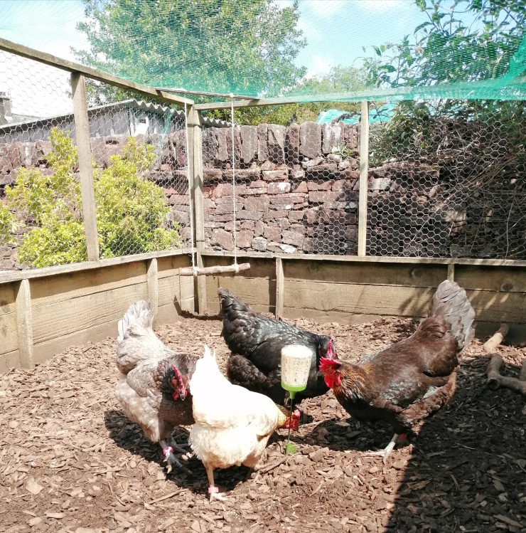 Beskrivelse: Hønsene føler sig trygge i deres løbegård