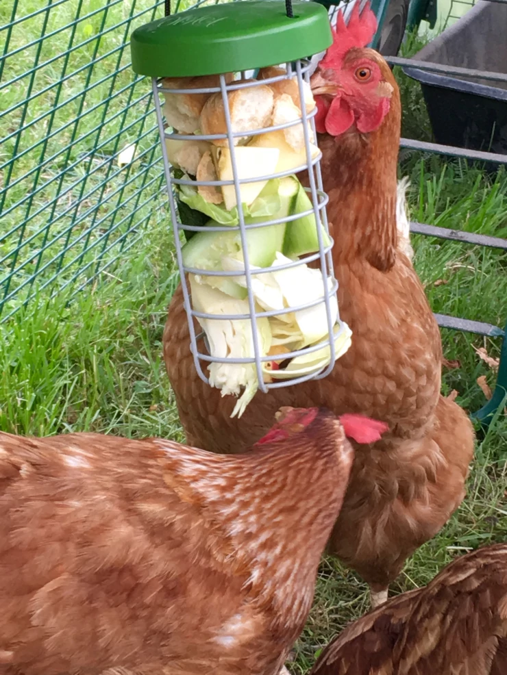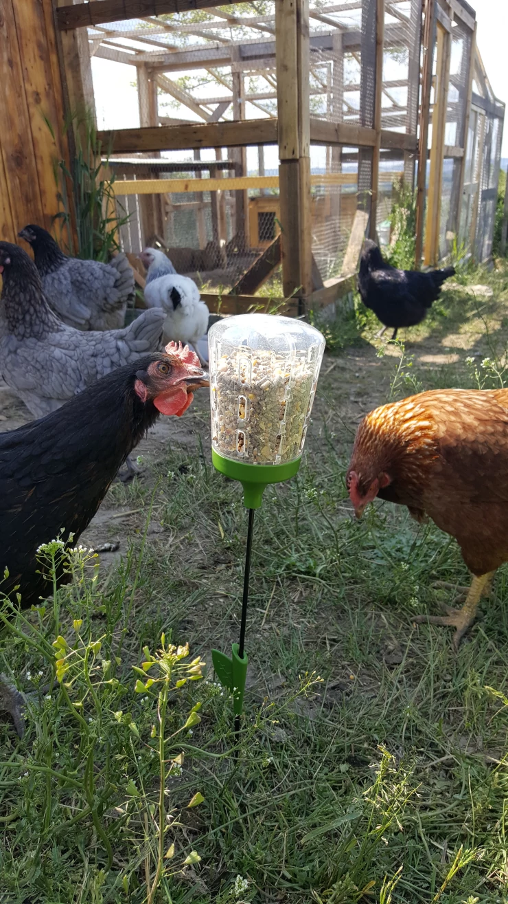 Beskrivelse: Høns elsker at spise majs fra pille legetøjet!