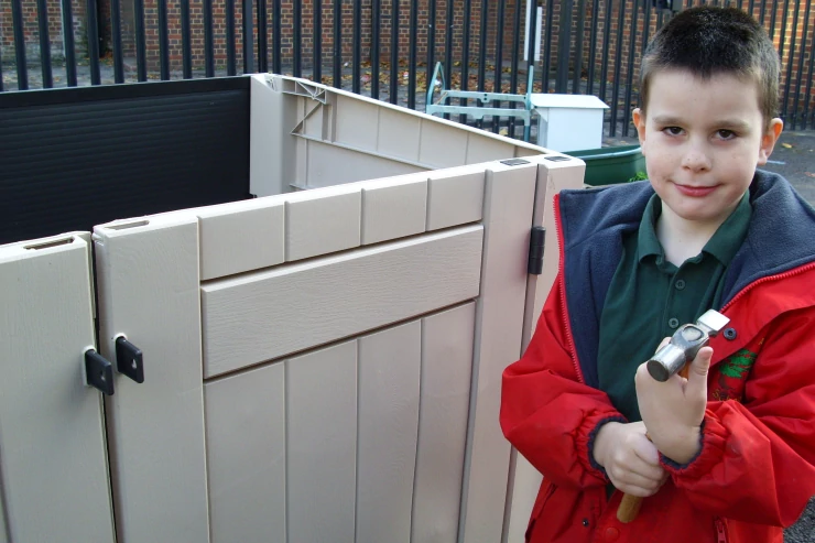 Beskrivelse: Billy fastgør dørhængslerne med et forsigtigt slag med hammeren