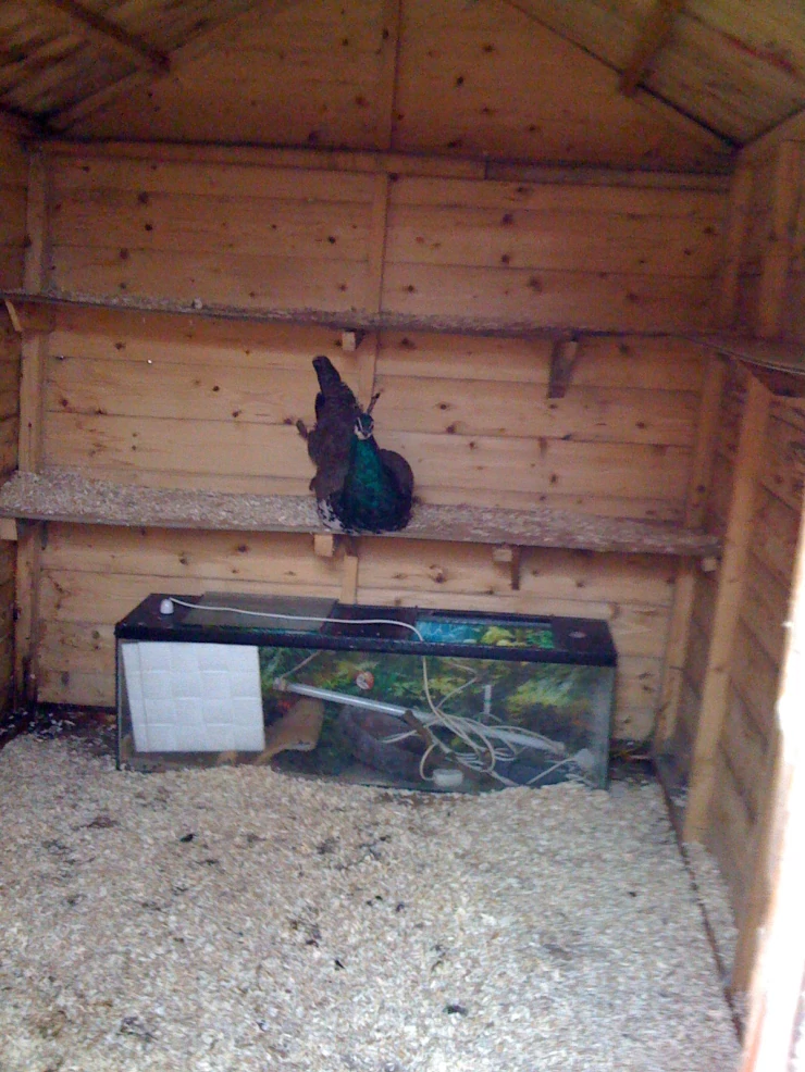 Beskrivelse: Zion min årige påfugl i skuret på en roosterskole